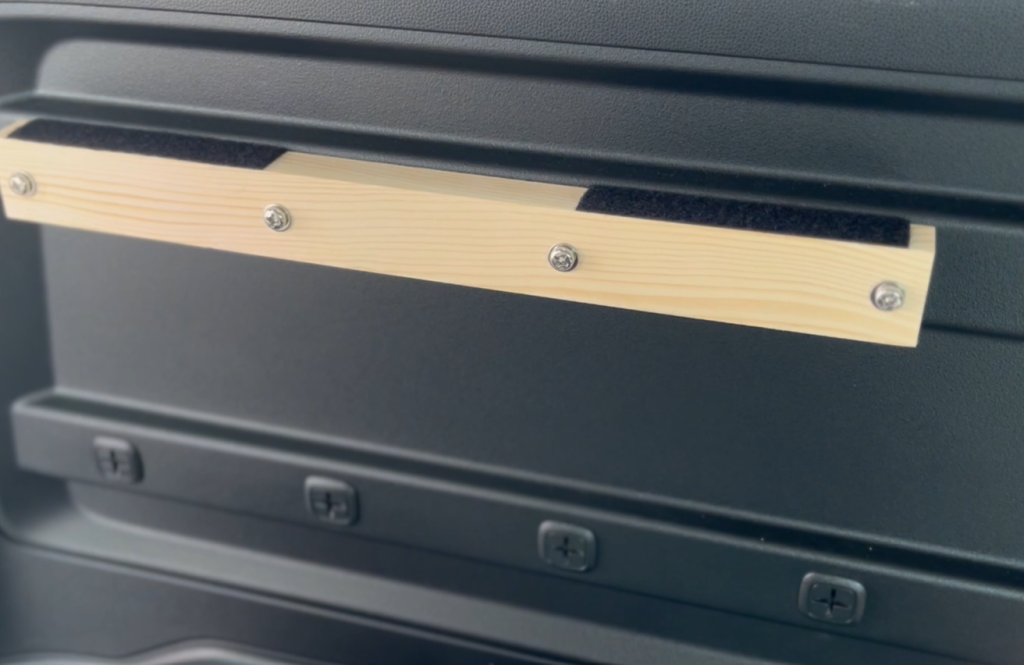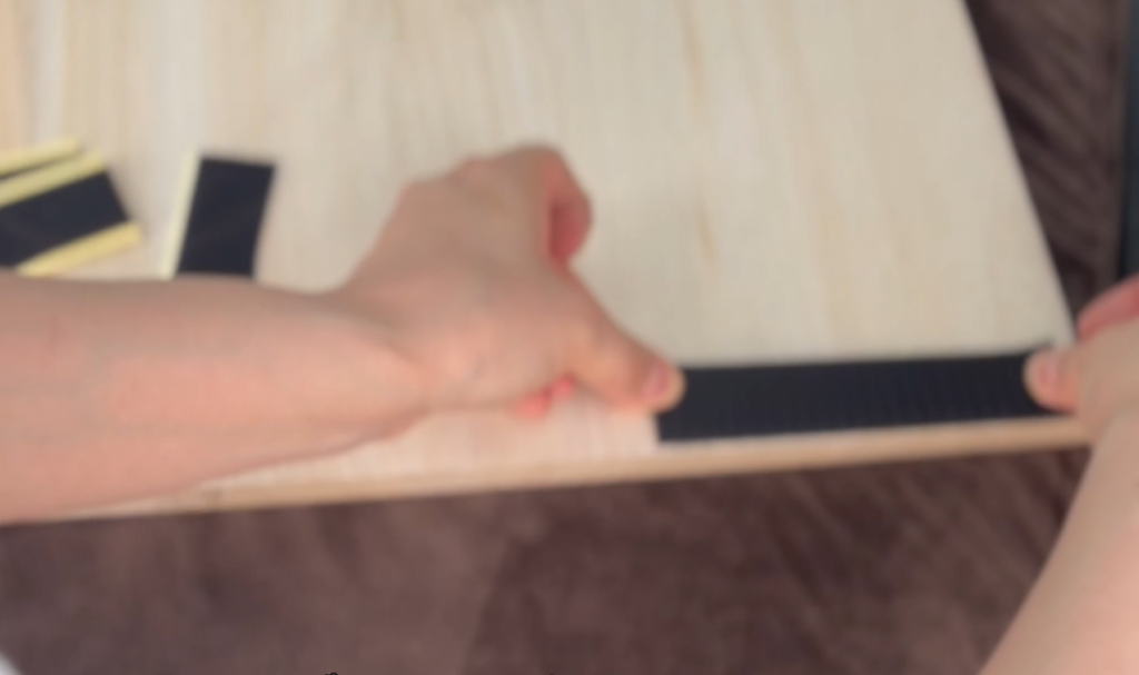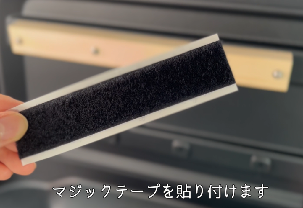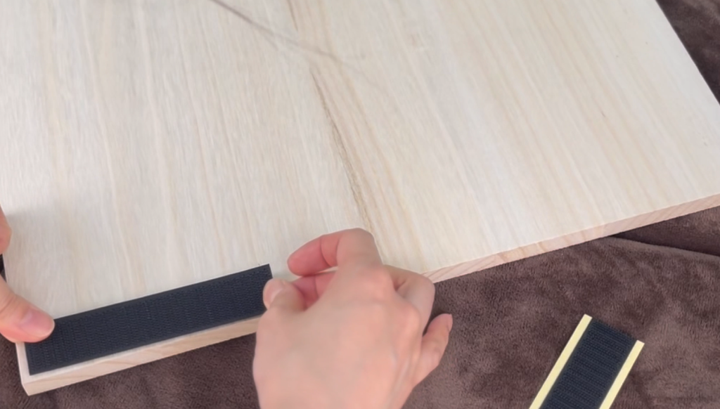 角材が取り付けられたら、今度は板を角材に乗せた時にズレないようマジックテープを板と角材に付けます。