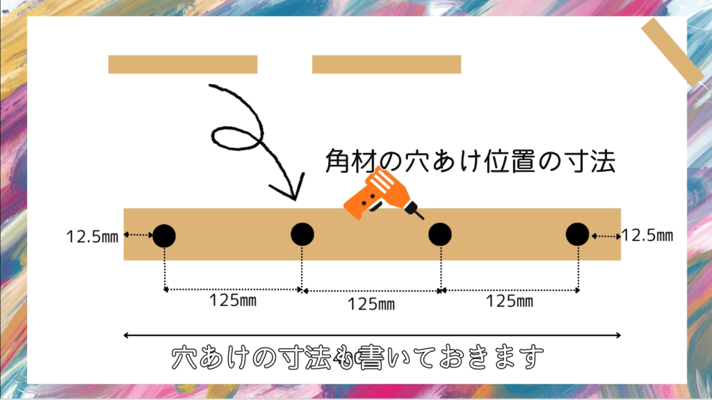 角材の端から1.25㎝のところから12.5㎝間隔で4ヵ所、M7サイズで穴あけをしてもらいました。