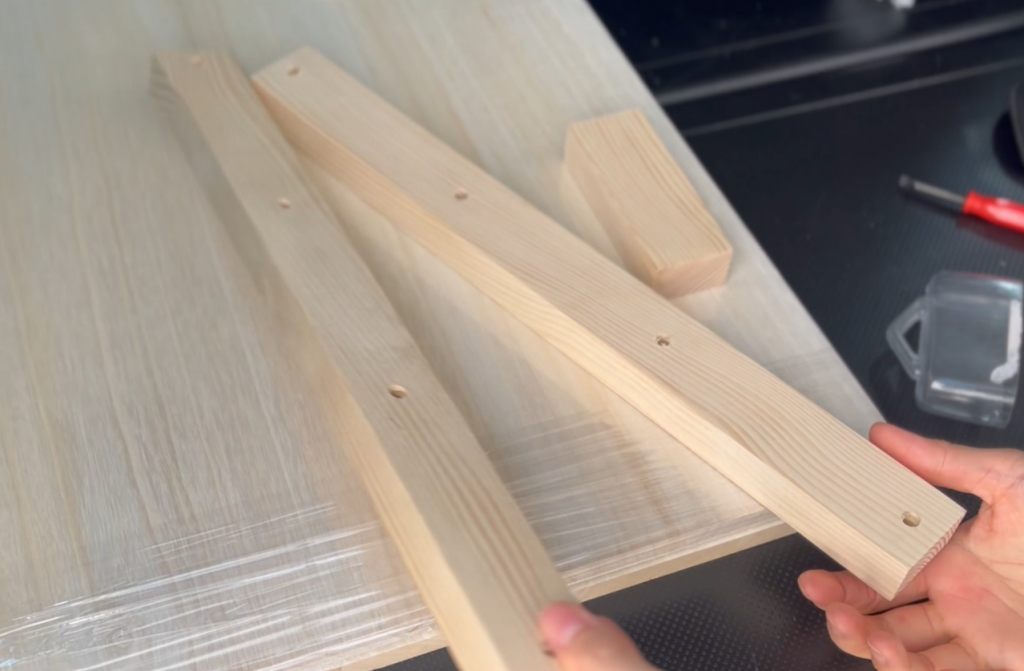- 板と角材に貼ったマジックテープがくっつくよう、オスとメス同士になるようにそれぞれ角材と板に貼ります。