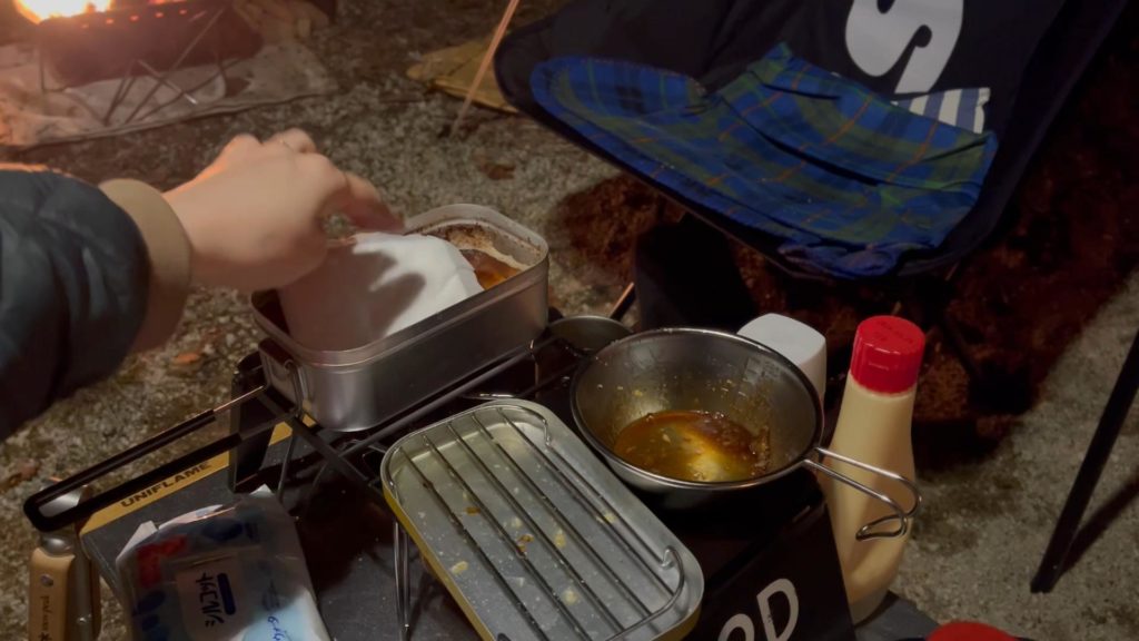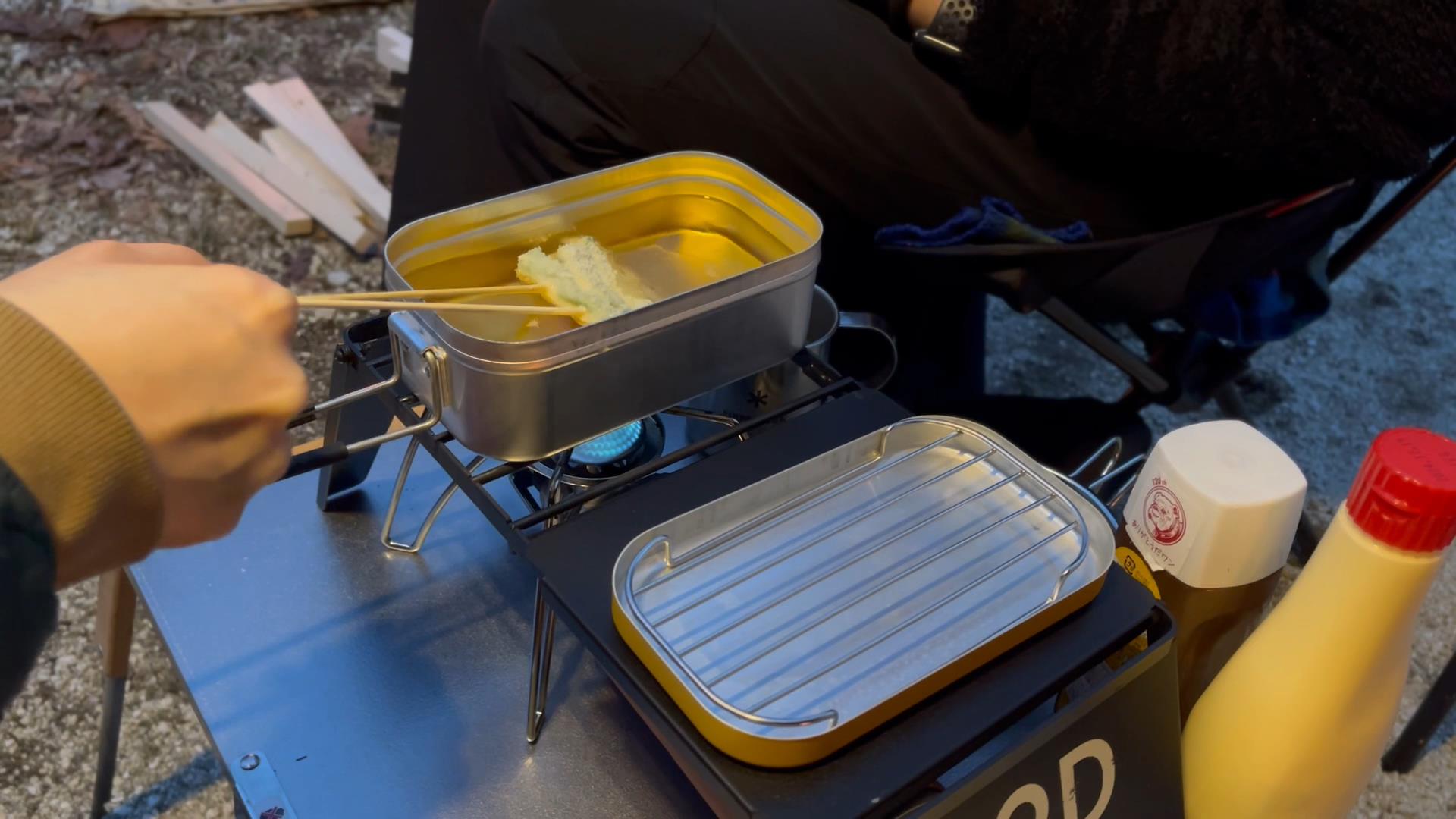 今回はメスティンを使用しましたが、メスティンの蓋に蒸網をのせると油切りとして使用することができました。