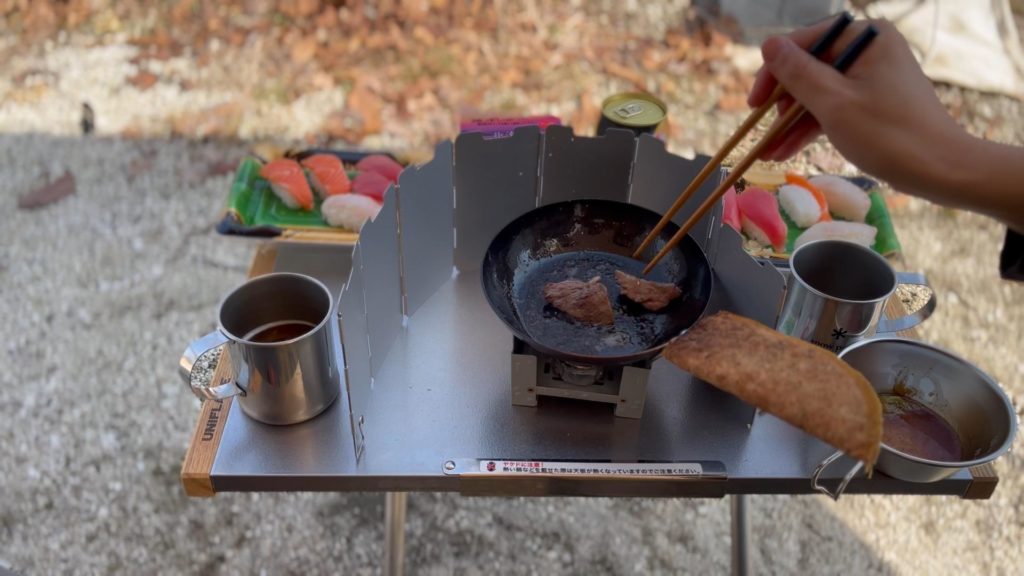 昼は前回のブログでお話したローカルスーパーで購入したお寿司や白老牛を焼いて食べました。詳しくは前回のブログかYoutube動画で公開していますので気になる方はぜひご覧ください。 設営後なので「焼くだけ」でちゃちゃっと食べられるものは助かります。その反面、夜のキャンプ飯は、前日に仕込んで持ってきて調理することが多いです。そう、メインは夜の宴ですから。