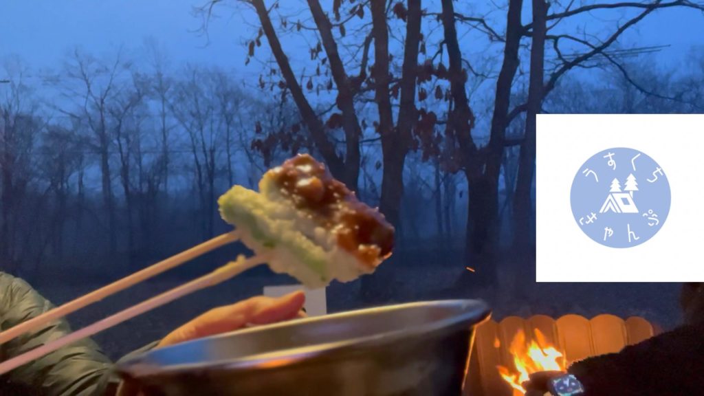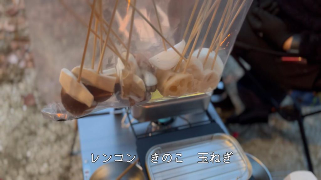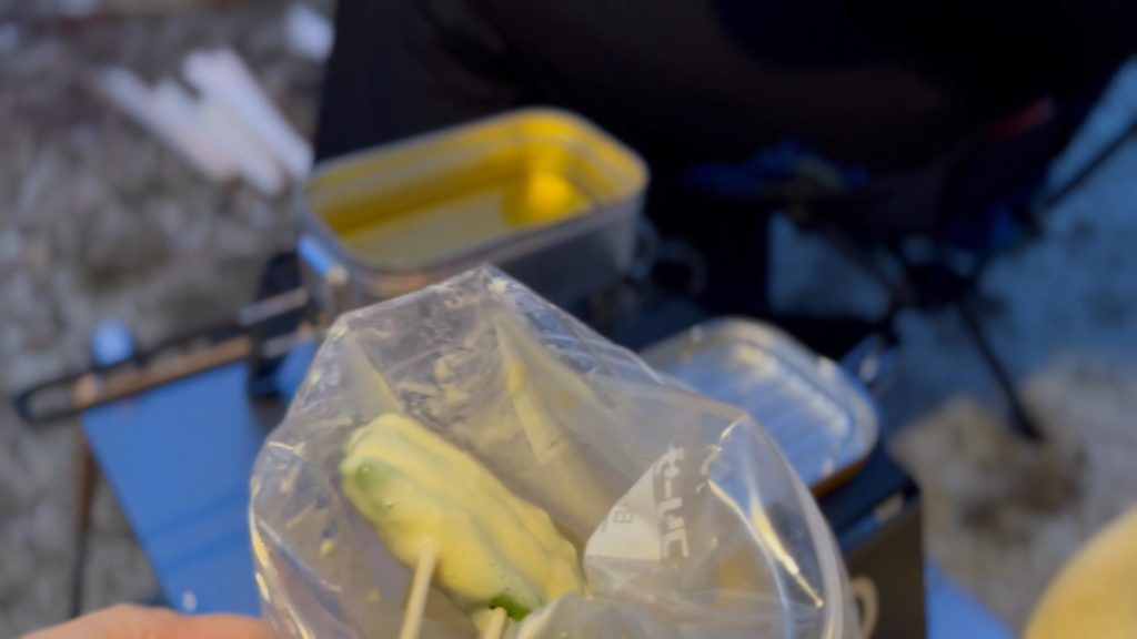 今回は何にしようか悩んだ挙句、直近で放送されていた「〇〇芸人」で有名なあのバラエティ番組を観て決めました。夜は『串カツ』です。ある芸人さんがキャンプで食べていたので、これだ!と夫と決めました。
