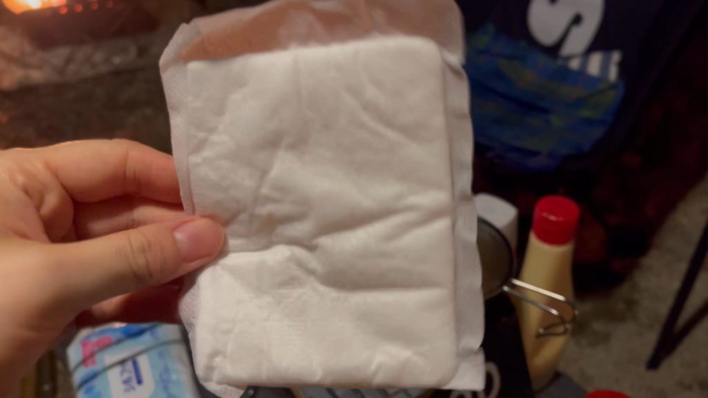 一つ難点を上げるとすると、後片付けが面倒でした。家で油を処理するのも面倒ですがキャンプではなおさらです。 今回はダイソーで購入した『廃油処理パッド』を使用しました。油を吸い取ったパッドは燃えるごみとして処理しました。一袋20枚入っていて、1枚で約80mlの脂を吸収すると書かれています。 メスティンに入れた400~500mlの油をこのパッド4~5枚に吸わせました。あとは材料を入れてきたジップロックなどに入れて持ち帰りました。