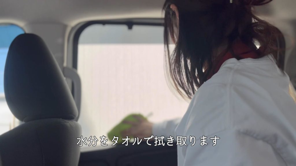 ④型が取れたらビニール袋を剥がし、窓の水分をタオルで拭き取る。