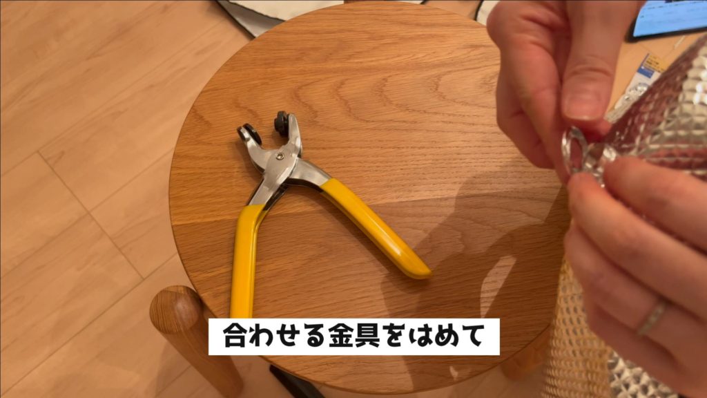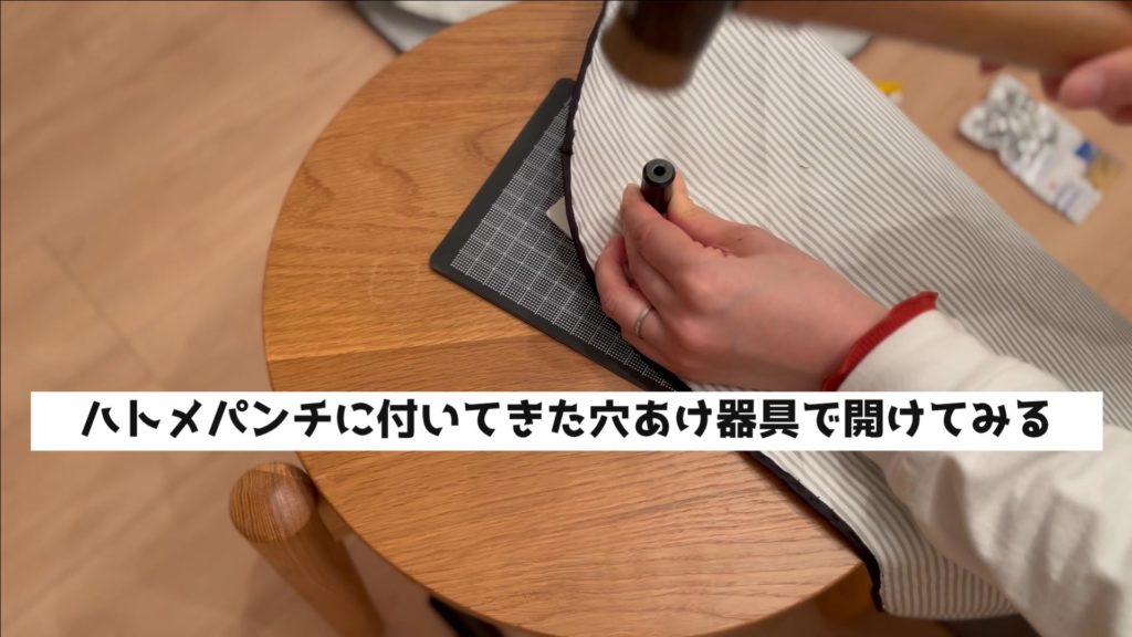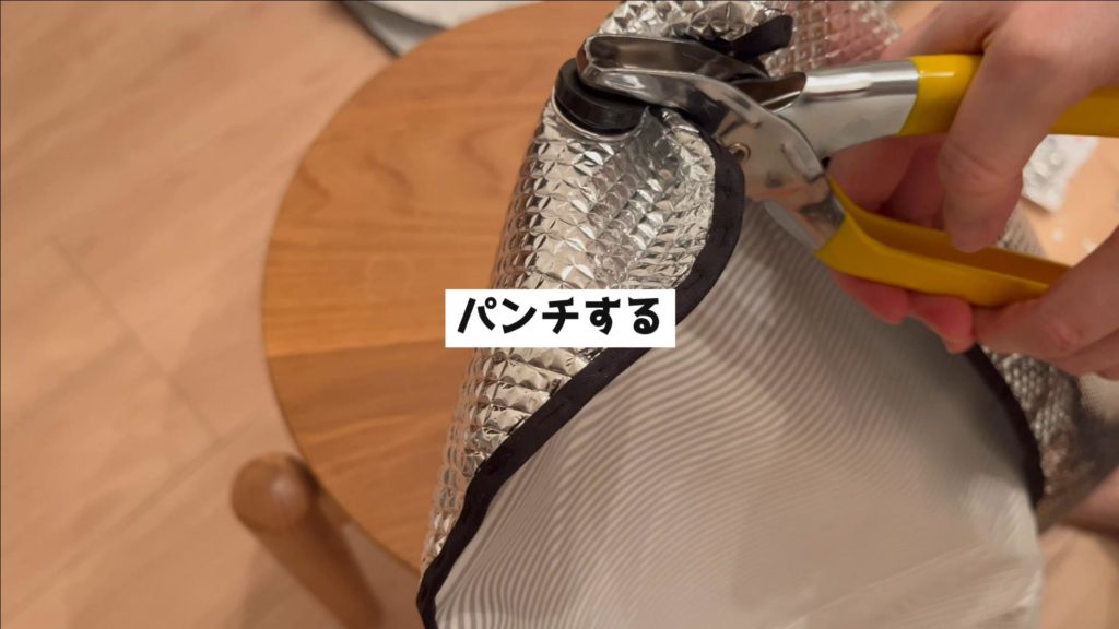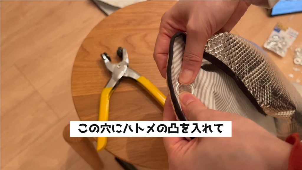 ウインドウに取り付けるために吸盤をシェードに取り付けます。吸盤を付けるためにハトメを付けます。