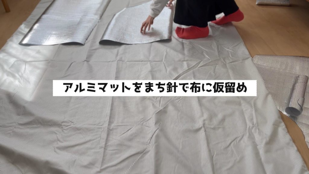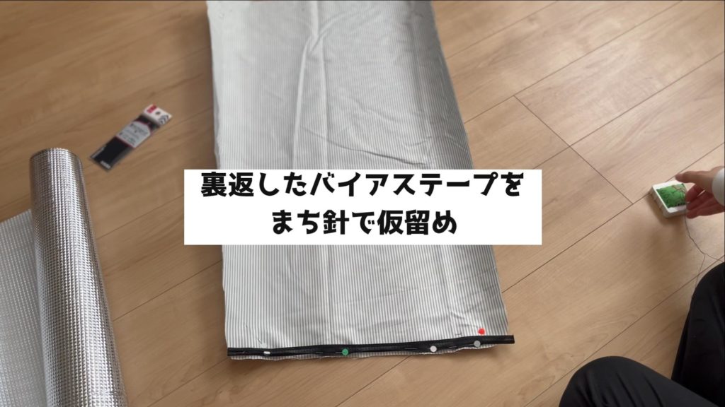 ⑪アルミシートと布を対称的に合わせてマチ針で仮留めしておきます。バイアステープを裏返し、折り目を開いて、布・シートの端に合わせるようにマチ針で留めていきます。商品の説明の載せておきます。