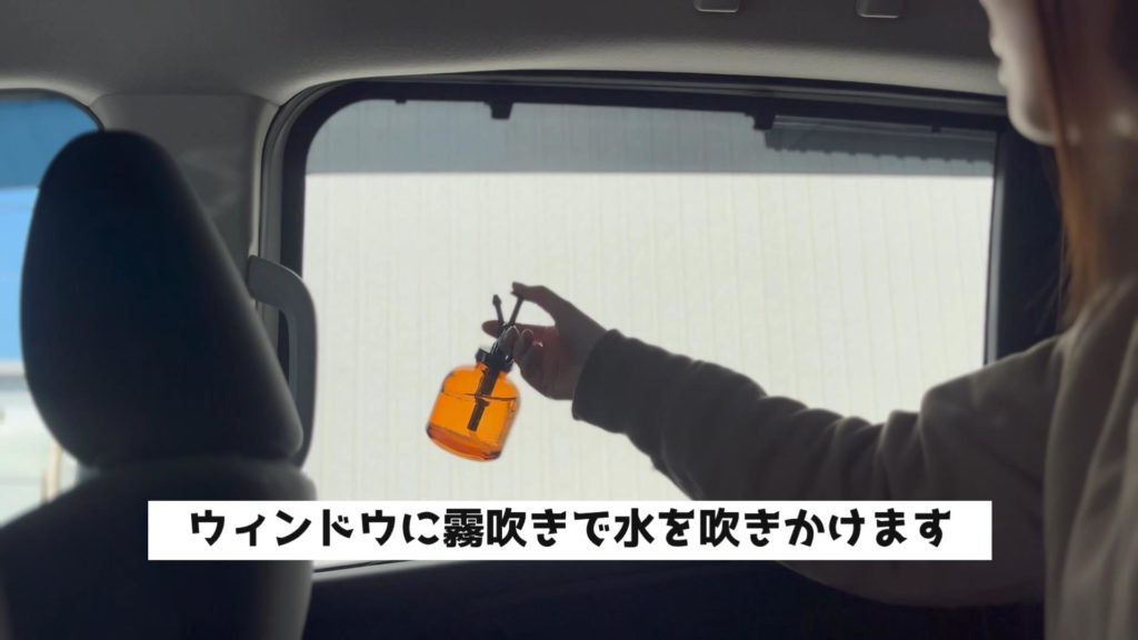 ②霧吹きで窓ガラスを濡らしビニール袋を張り付ける。私は内側からですが、公式では外側から行っていますね。