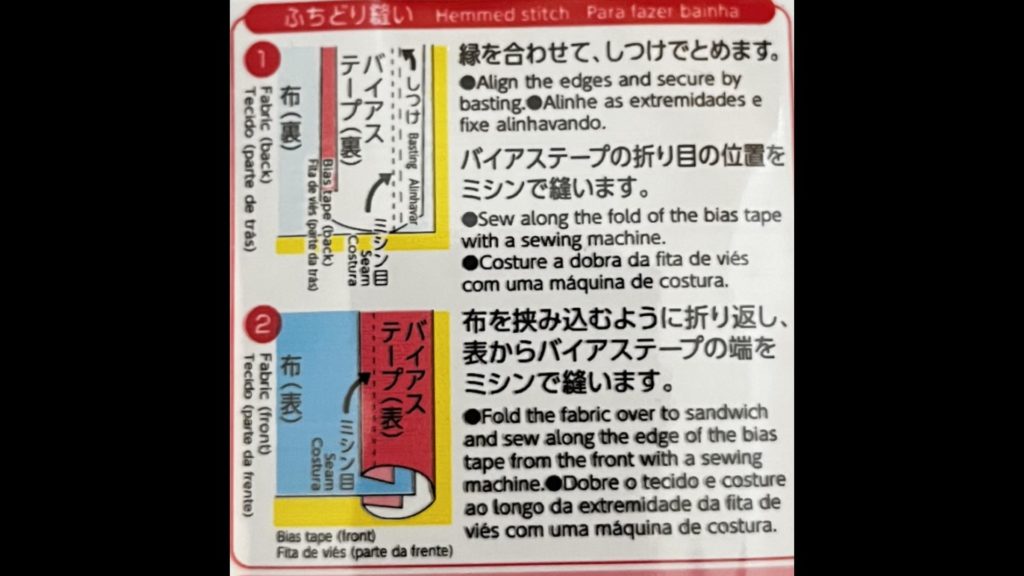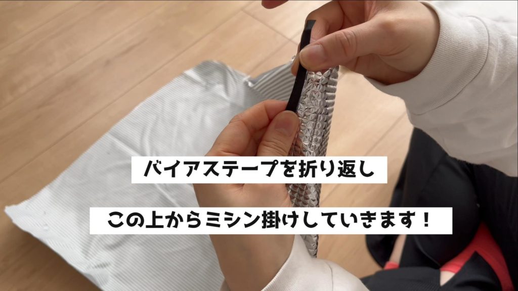 アルミシート(車外側)と布(車内側)を縫い合わせていきます。そのために縁取りするためのバイアステープを使用します。これが難解でした…