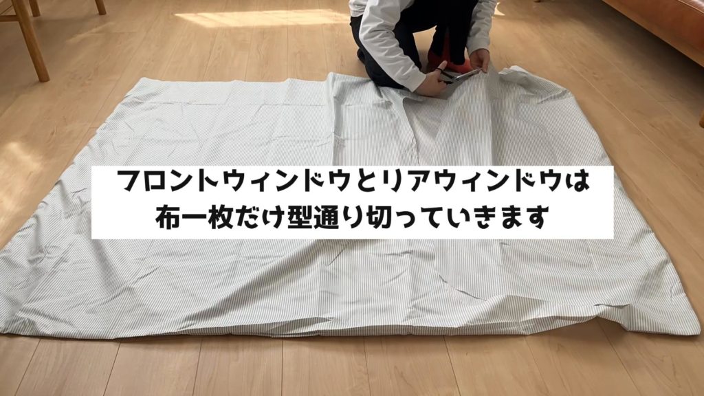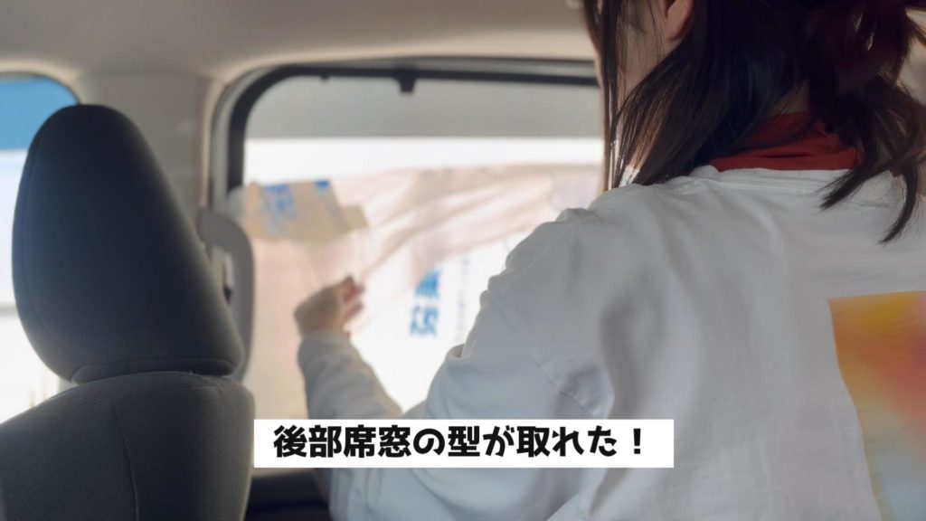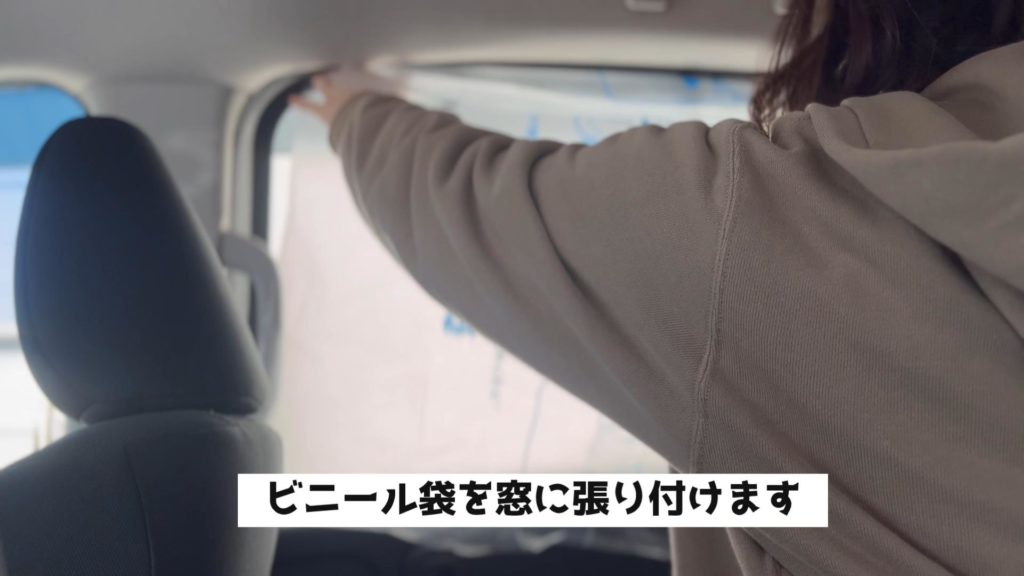 ⑤同様にリアウィンドウ、後部の小窓、助手席、前方の小窓の片方も型取りします。そのあとはマジックペンの型通りにビニール袋を切ります。