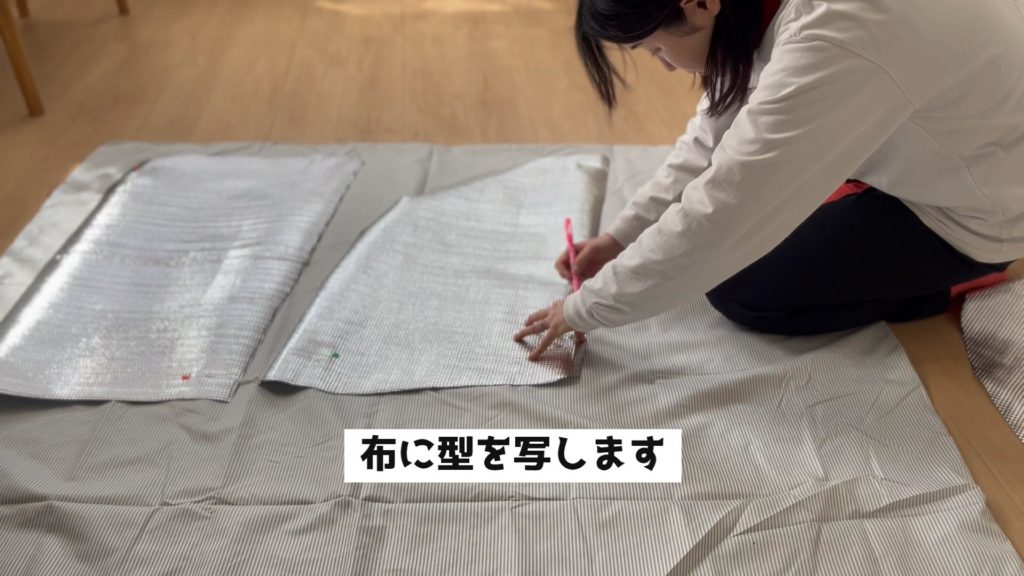アルミシートを型代わりにします。布とアルミシートをマチ針で仮留めしてから型を写します。
