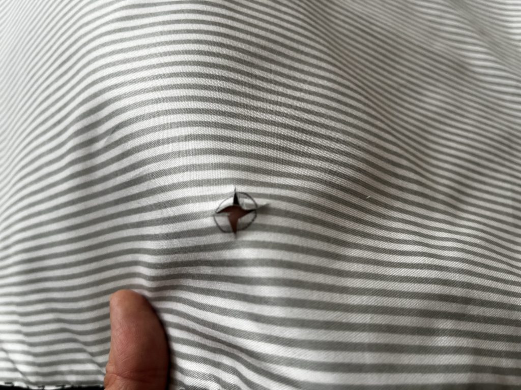 ⑭シェードに穴を開けます。吸盤を取り付けたい箇所に丸印などを付けてハトメパンチに付属していた穴あけ器具を使用しました。穴を開けるときの音が大きいのと、思ったより穴が開かなかったので、ハサミで小さく十字の切れ込みを入れてもうまくいきました。