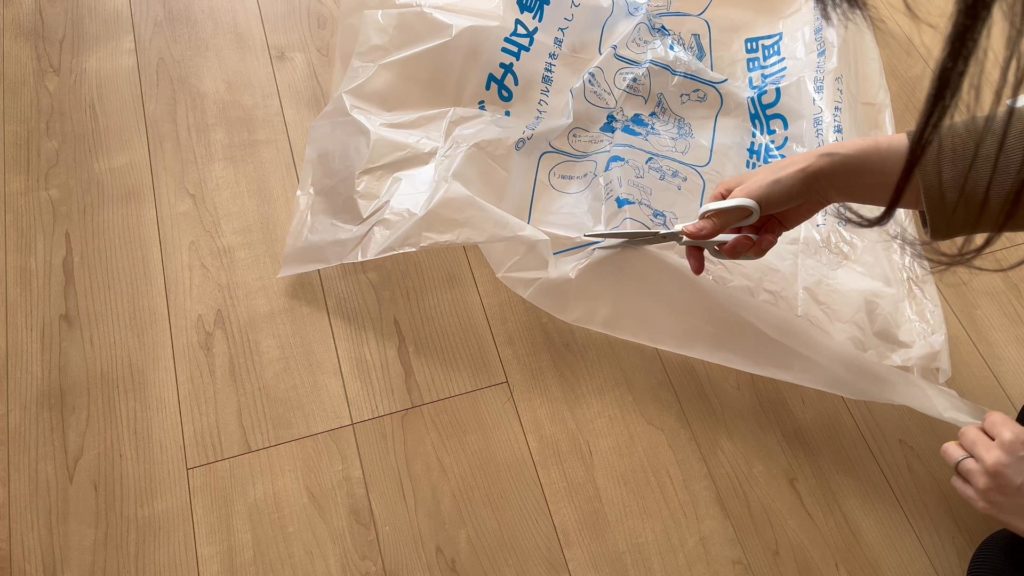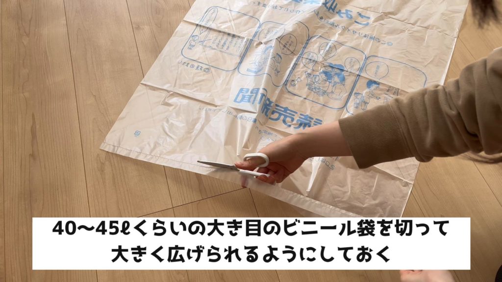 ①40~45ℓくらいのビニール袋を一枚で使用できるように、底の部分と輪の部分を一方のみ切る。