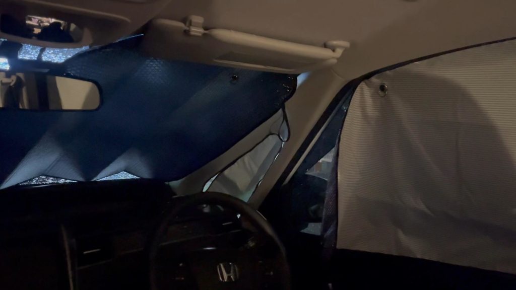 使用した状況では、夜間~朝は外気温が一桁台となりましたが電気毛布など暖房器具は使用せず秋冬用のシュラフを布団代わりにする程度でした。アルミシートは保温性があるせいかそれほど車内が寒くなることはなかったように感じました。