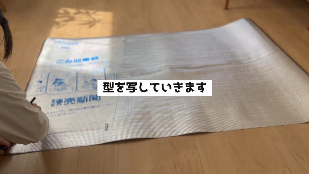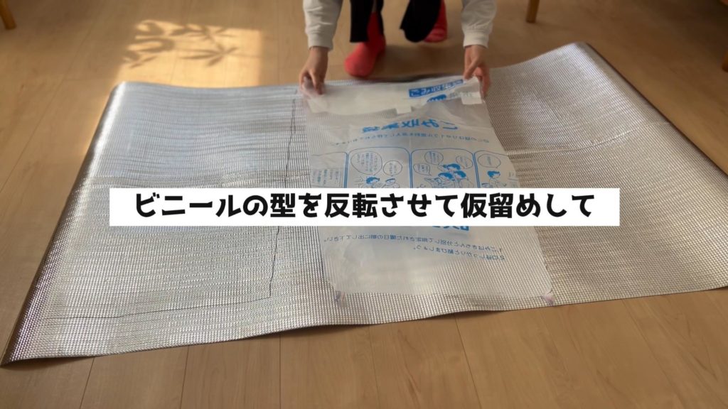 ⑥保温アルミシートに型を写す。マスキングテープでビニールの型を固定してから写すといいでしょう。